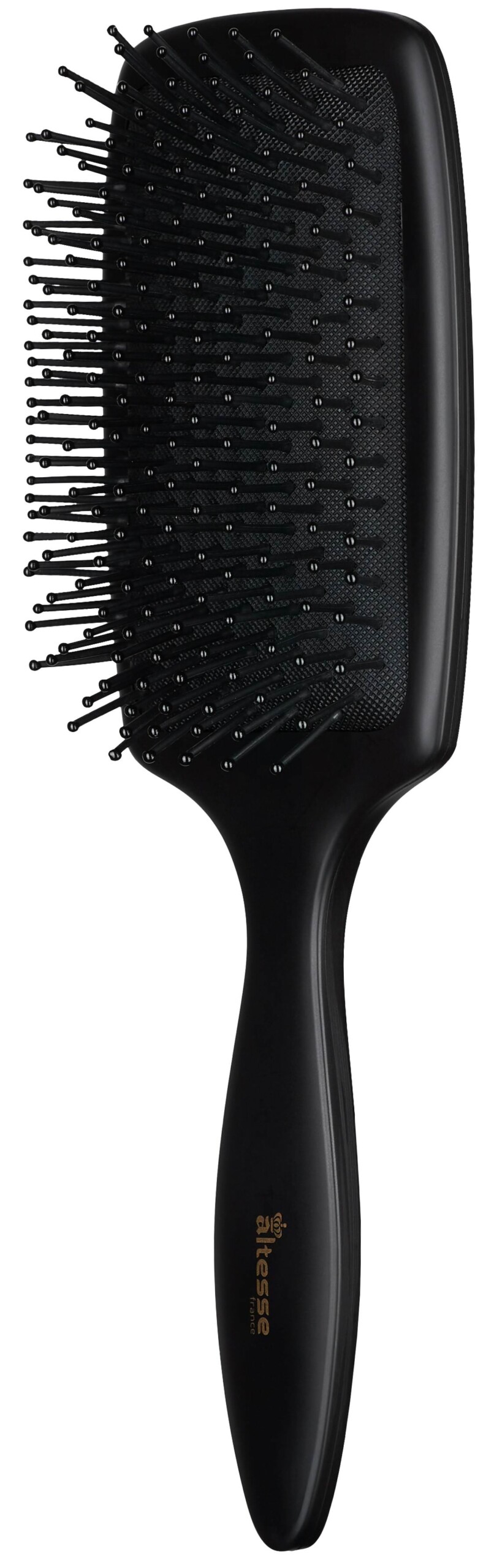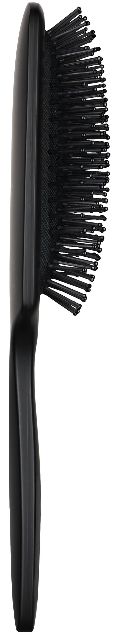 Paddlebürste mit großem Luftkissen zum Durchkämmen und Entwirren. Die mit kleinen Noppen versehenen Kunststoffborsten schonen Haar und Kopfhaut und spenden eine wohltuende Kopfhautmassage.