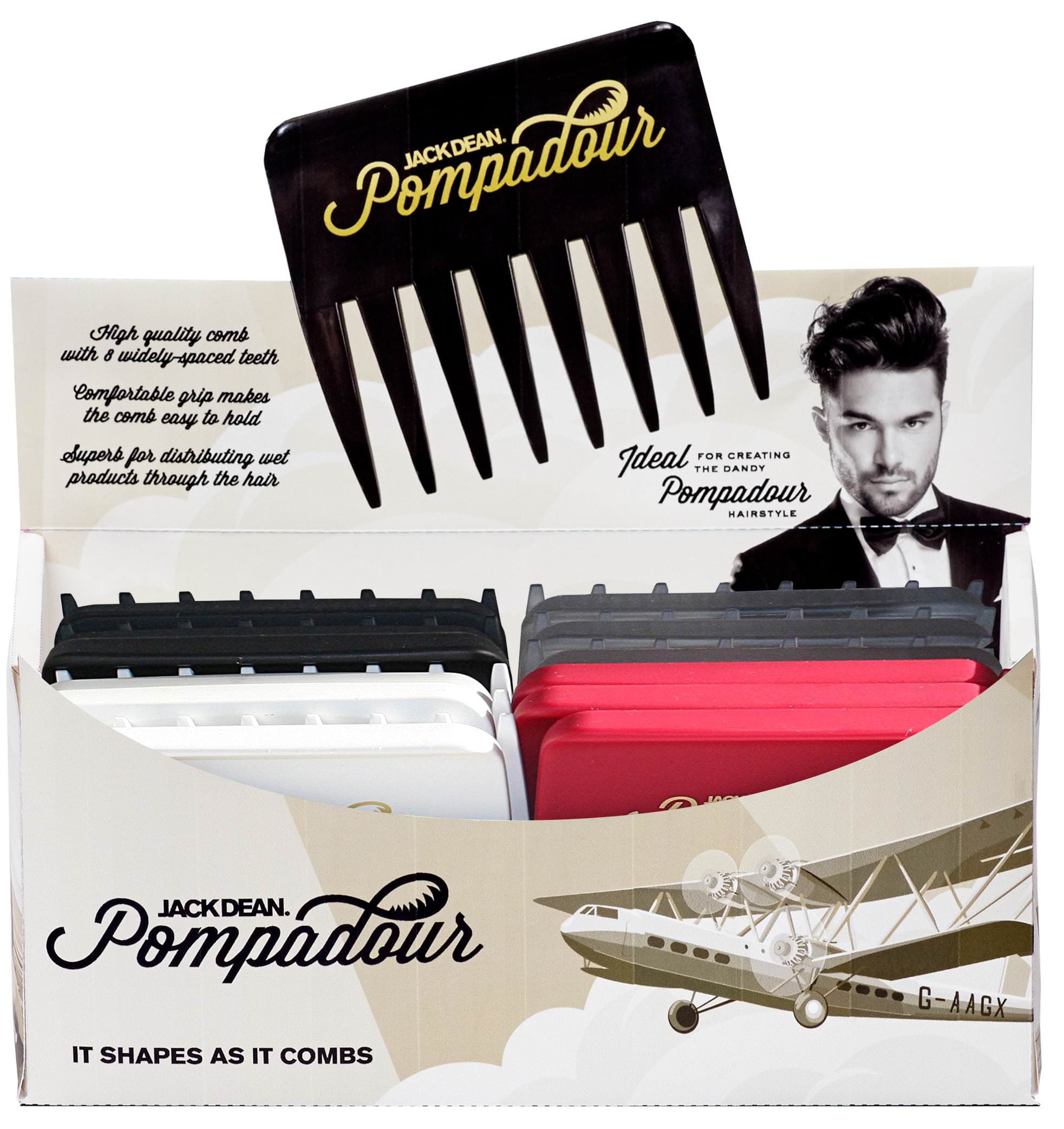 – 24er Display mit je 6 Pompadour Kämmen in 4 Farben (schwarz, weiß, rot, transparent)