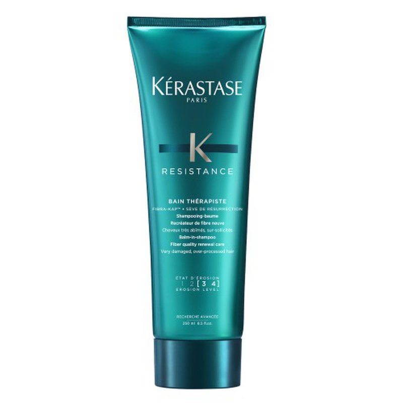Mit dem reinigenden Résistance Bain Thérapiste Shampoo von Kérastase kann brüchiges und stark strukturgeschädigtes Haar wieder aufgebaut werden. Die Formulierung mit Fibra Kap und dem wiederbelebenden Pflanzenextrakt der Myrothamnus Flabelifollius ummantelt jedes einzelne Haar während der Haarwäsche, reinigt das Haar sanft und bewahrt es vor Reibung. Zugleich wird das Haar aus dem Inneren heraus aufgebaut und jede Haarfaser sieht geschmeidiger und glänzender aus.
