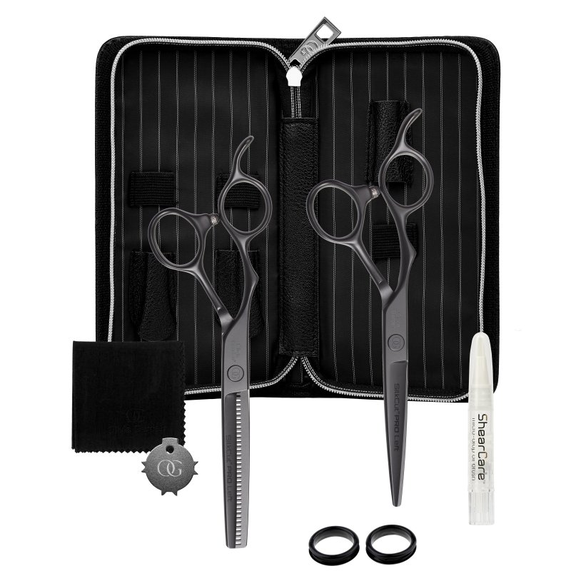 Das 2er Set enthält eine Haarschere (5,75“) und eine Modellierschere (6,0“) in europäischer Ausführung mit 35 Zähnen sowie Einstellwerkzeug, Scherenöl, Fingerringe, Mikrofasertuch und eine Reißverschlusstasche. Geeignet für Linkshänder.