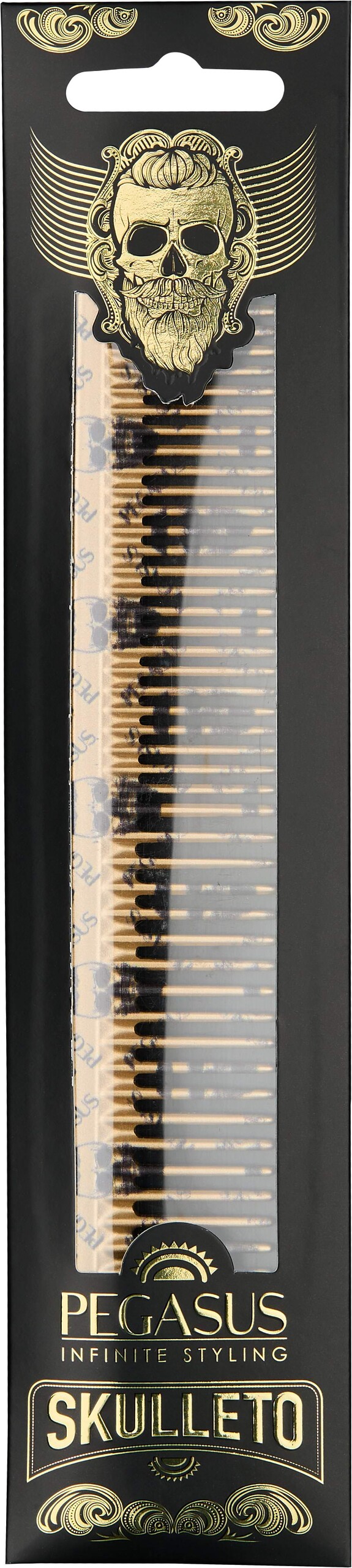 Pegasus Skulleto mit dem charakteristischen Totenkopf-Print. Dieser stylische Kamm wurde handgearbeitet und ist dadurch gratfrei mit perfekt abgerundeten Zähnen, die Haare und Kopfhaut schonen.