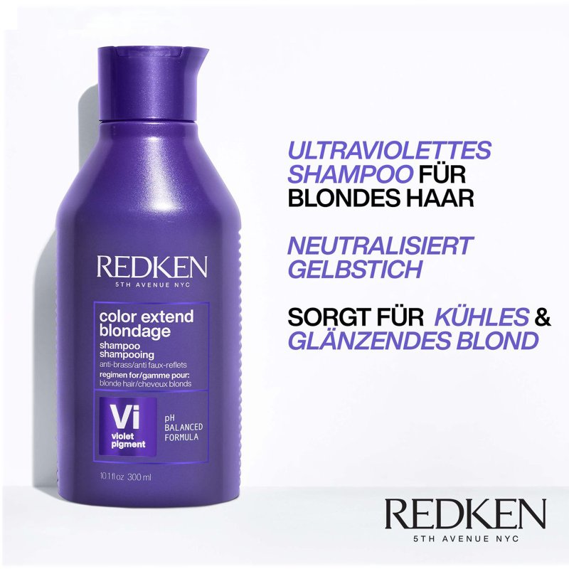 Mit dem Redken Color Extend Blondage Shampoo 300 ml wird das Haar von innen durch den Triple Acid Protein-Komplex gekräftigt und gestärkt. Ultraviolette Farbpigmente neutralisieren unerwünschte Gelb-/Orangereflexe bei blondiertem Haar.