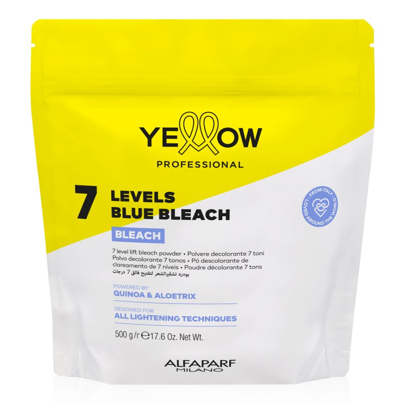 Yellow Professional Blue Bleach 7 Levels ist ein veganes Aufhellungspulver mit lichtblauer Farbe und integrierten Anti-Gelbstich-Pigmenten. Es ermöglicht eine zuverlässige Aufhellung von bis zu 7 Tonstufen und ist vielseitig für verschiedene Blondiertechniken geeignet.